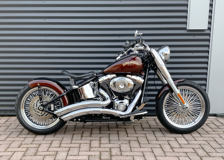 Deze Fatboy custom uit 2008 is voorzien van een aantal mooie extra's zoals Roothbeer/black, Big spoke wheels, Hollywood stuur, Big radius uitlaat