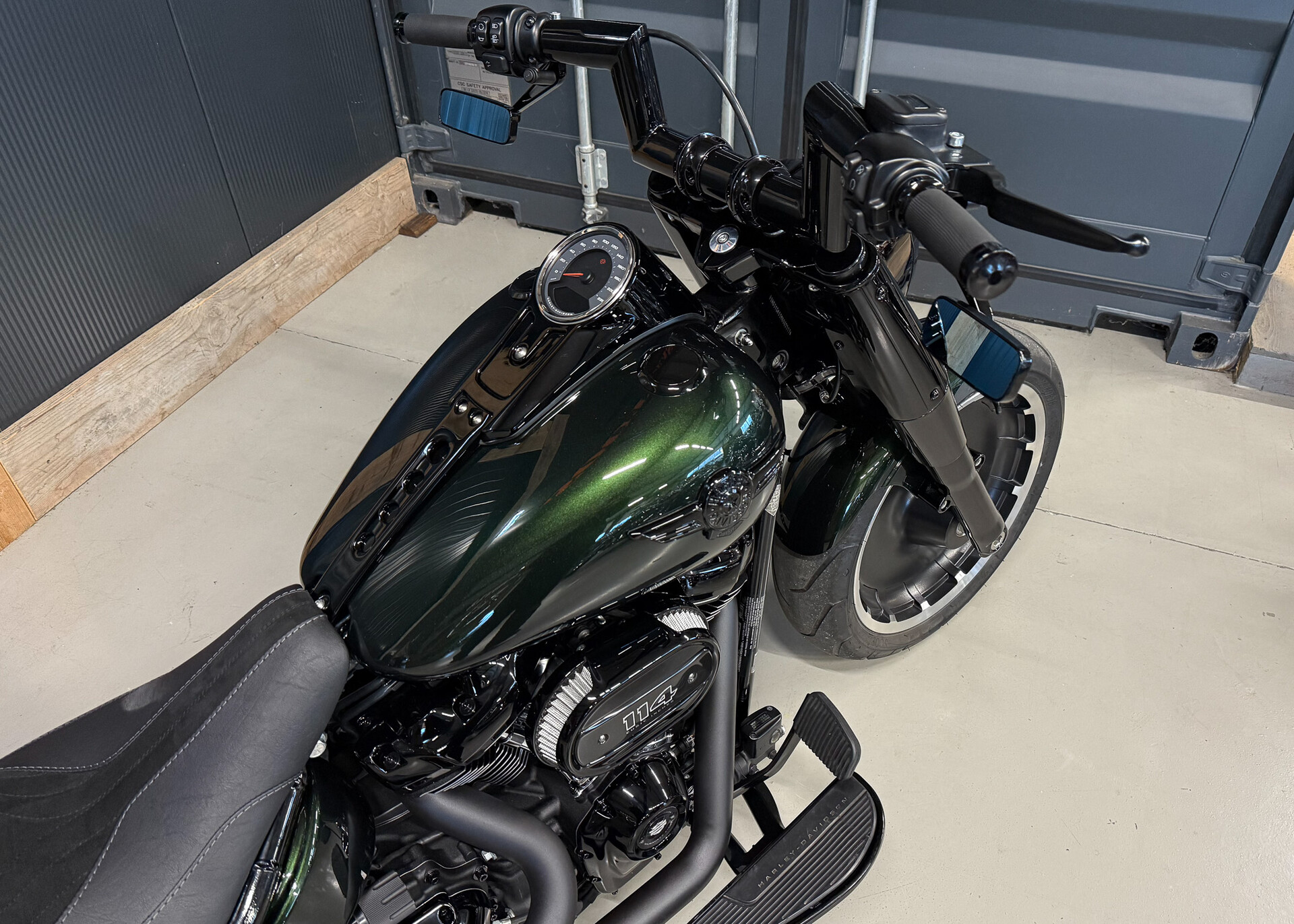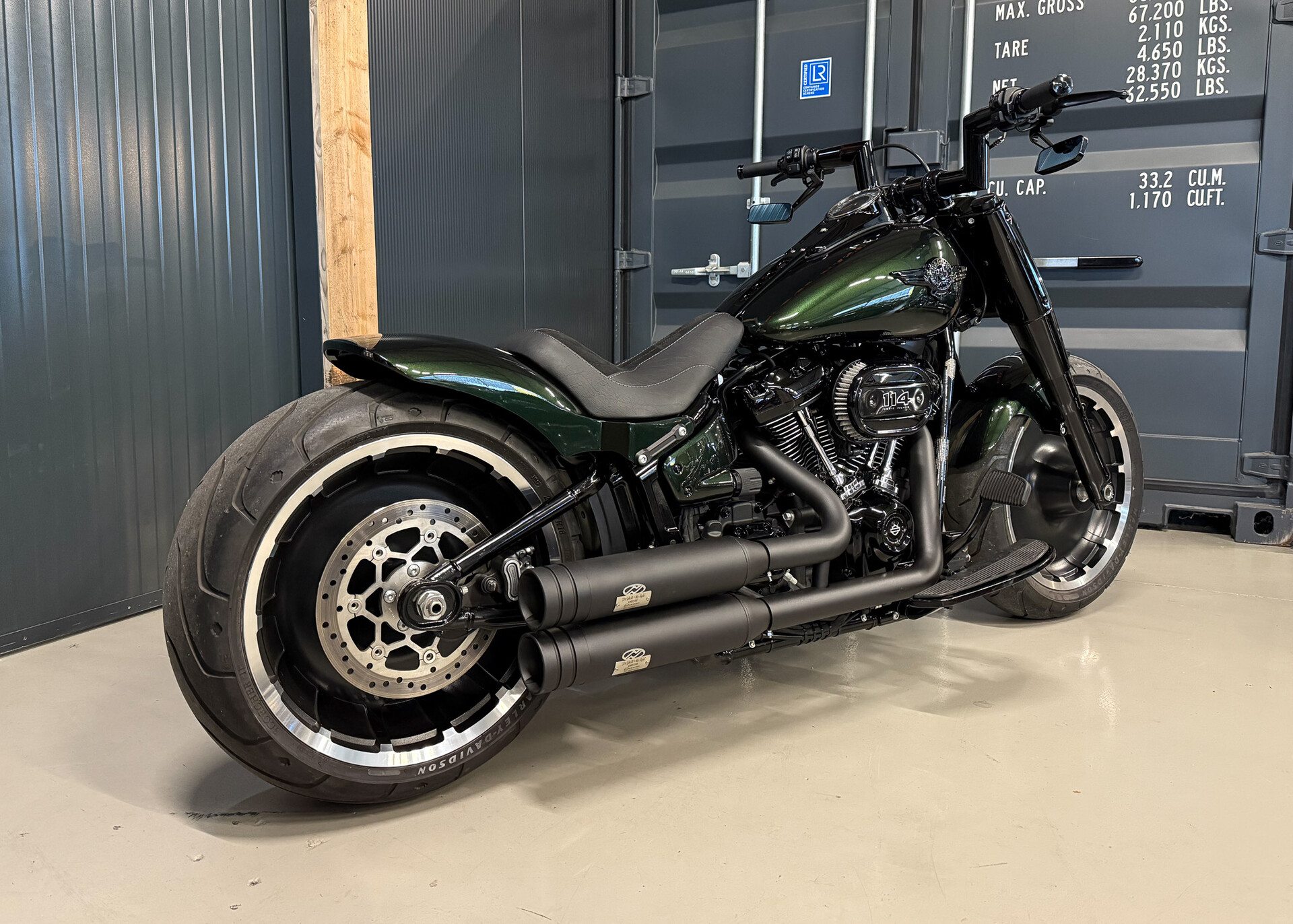 Deze allernieuwste Harley-Davidson FLFBS Fatboy 'Furious Forest' Custom uit 2021 is voorzien van een complete South-East custom verbouwing. Deze Fatboy is o.a. voorzien van een Jekill & Hide uitlaat, een custom hanblebar, custom zadel, all-over black en een unieke 'Furious Forest' custom paint. Deze 2021 Fatboy is tevens een BTW-motor.