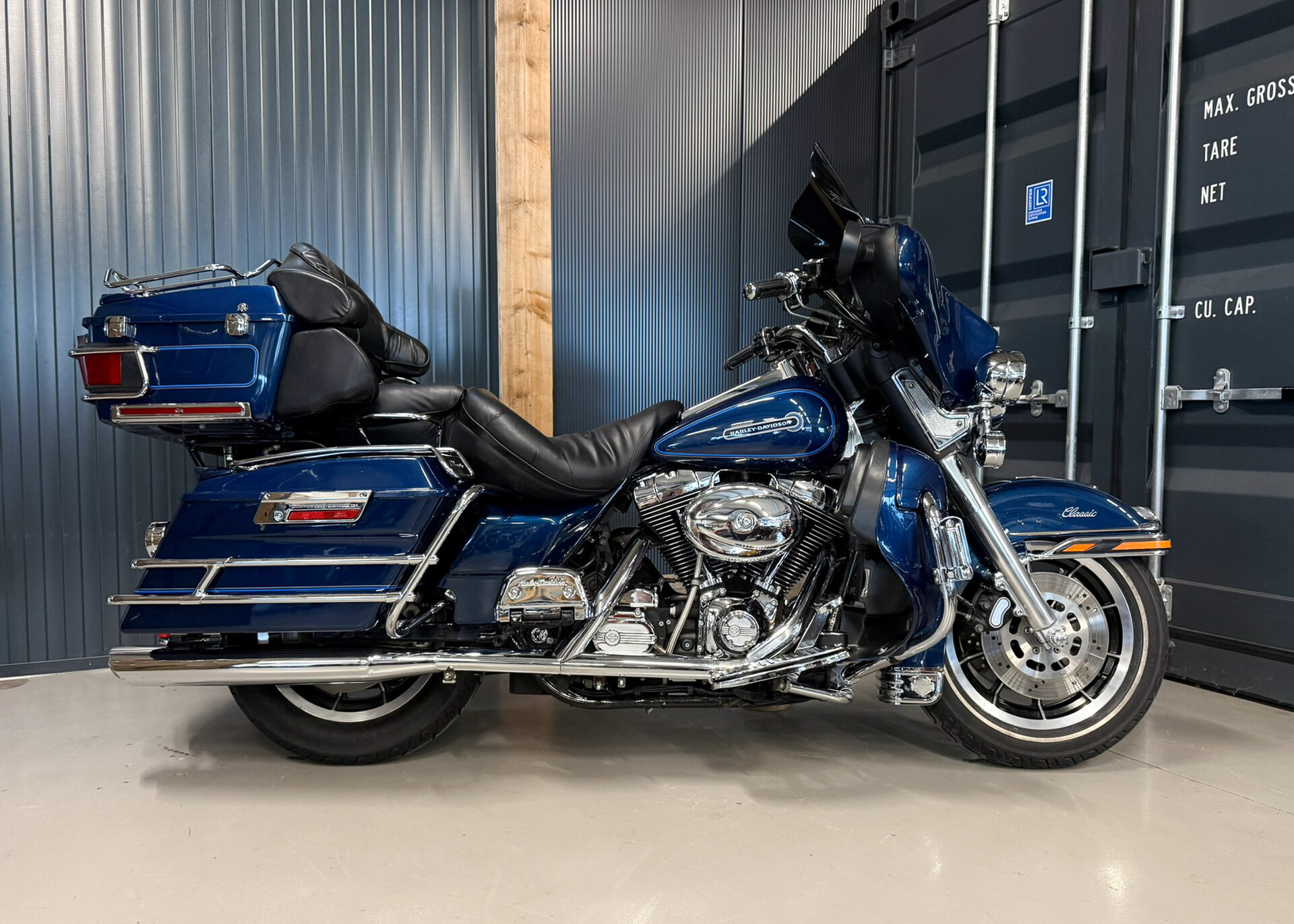 Deze Harley-Davidson Electra Glide Classic uit 1999 is o.a. voorzien van een Vance & Hines uitlaat, Blue metallic paint, topkoffer verlichting, topkofferrail, koplamp- & knipperlichtringen, glow ledverlichting voor- & achter, windsplitter, chrome bediening, luxe zadel, beenschilden met luidsprekers, floorboard inserts, highway pegs en meer..