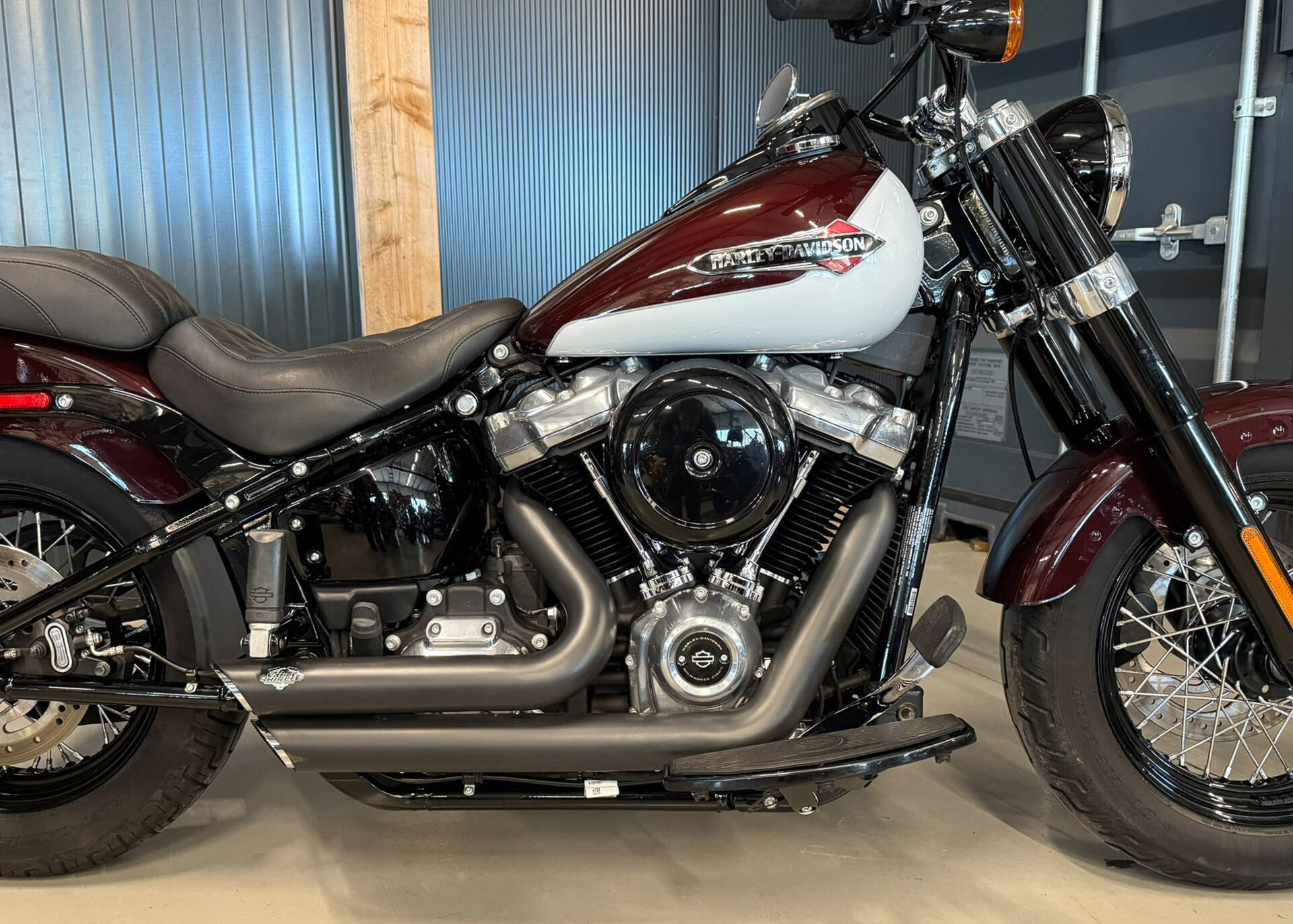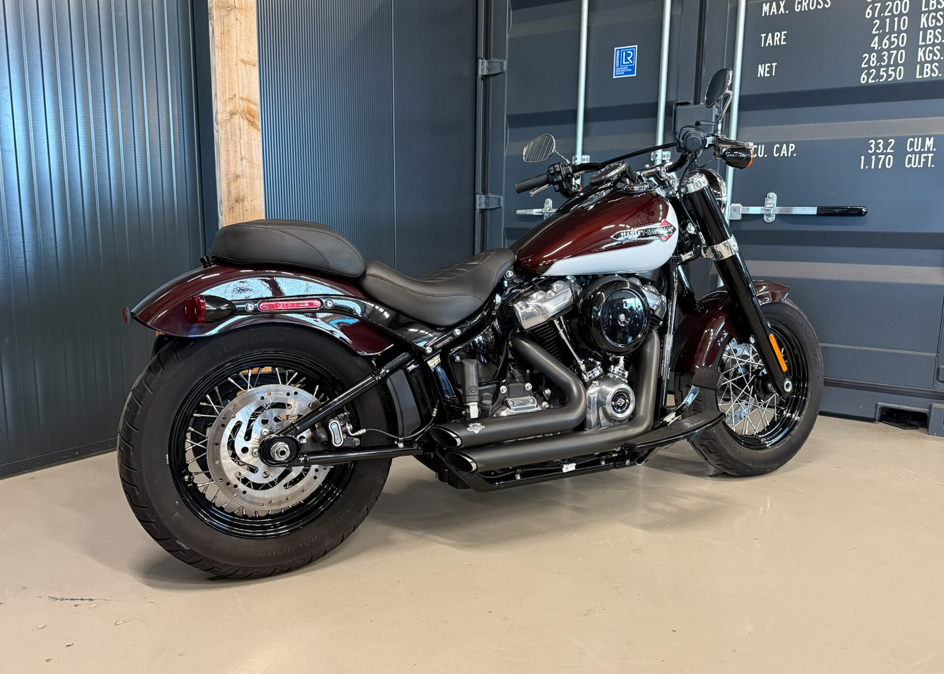 Deze Harley-Davidson Softail Slim uit 2021 is o.a. voorzien van Vance & Hines shortshots, mustang seat, two-tone white burgundy paint en meer..