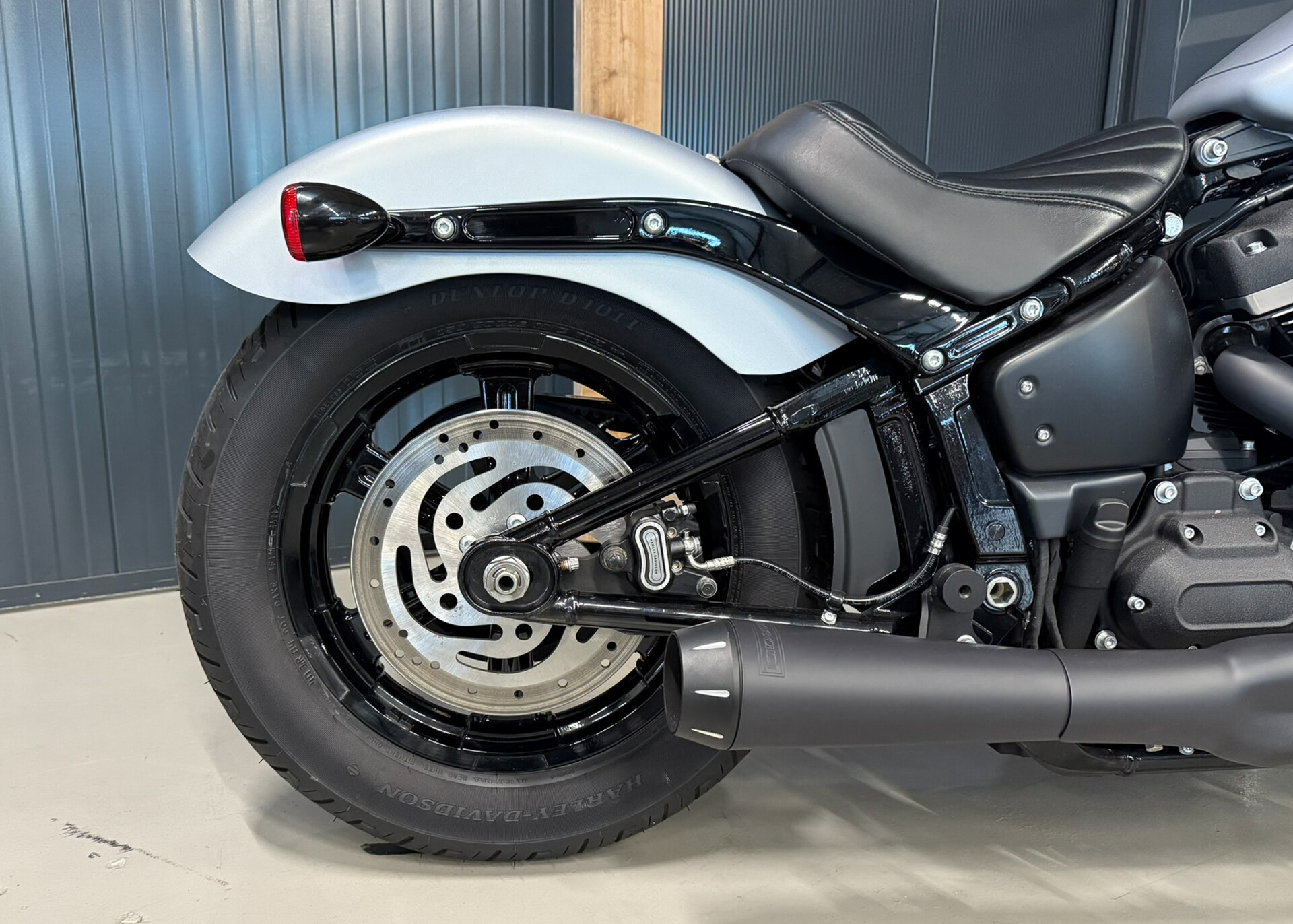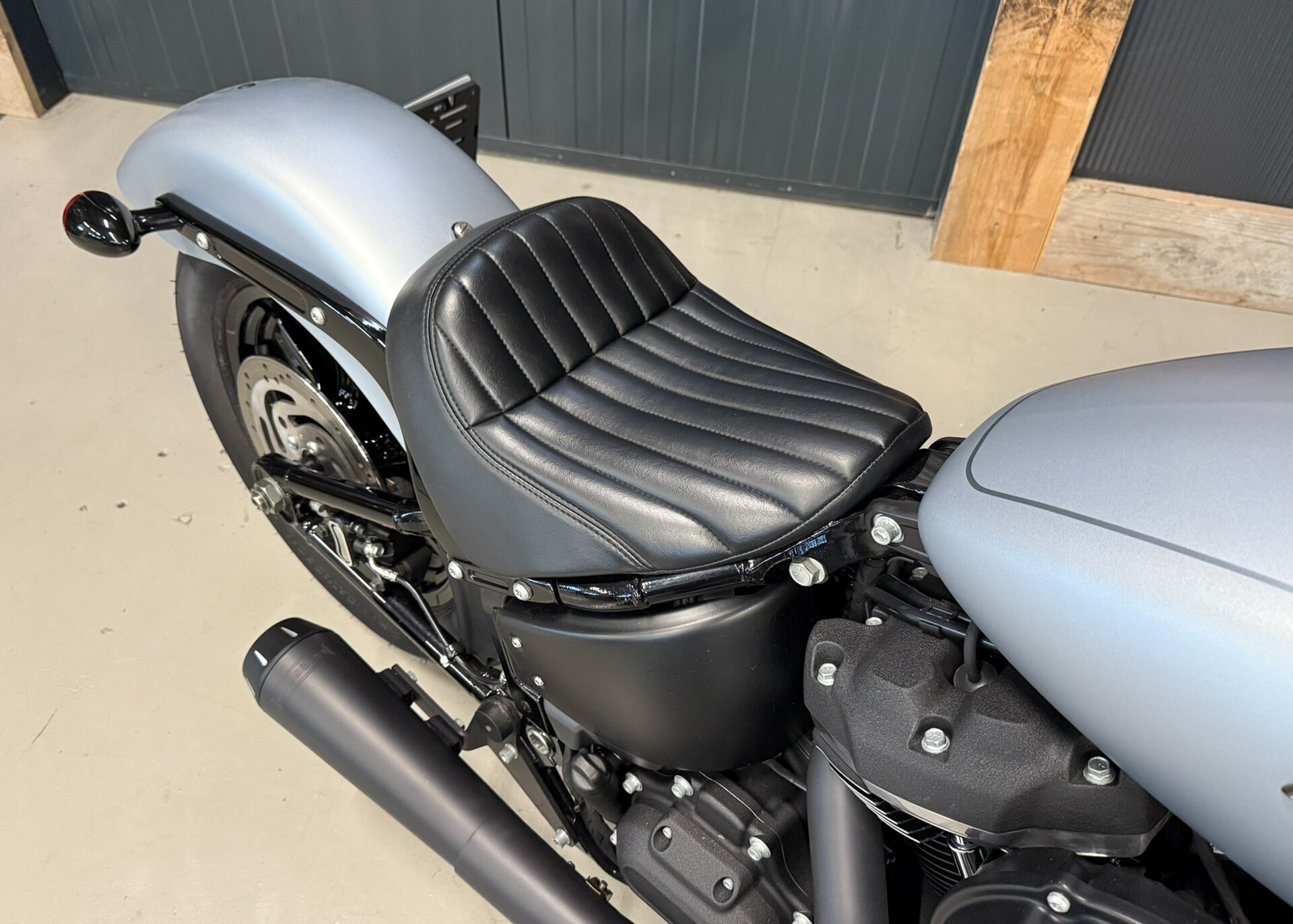 Deze Harley-Davidson Street Bob uit 2020 is o.a. voorzien van een 2-1 Bassani uitlaat, 2024 HD wielen, 11 inch apehanger, denim grey paint en meer..