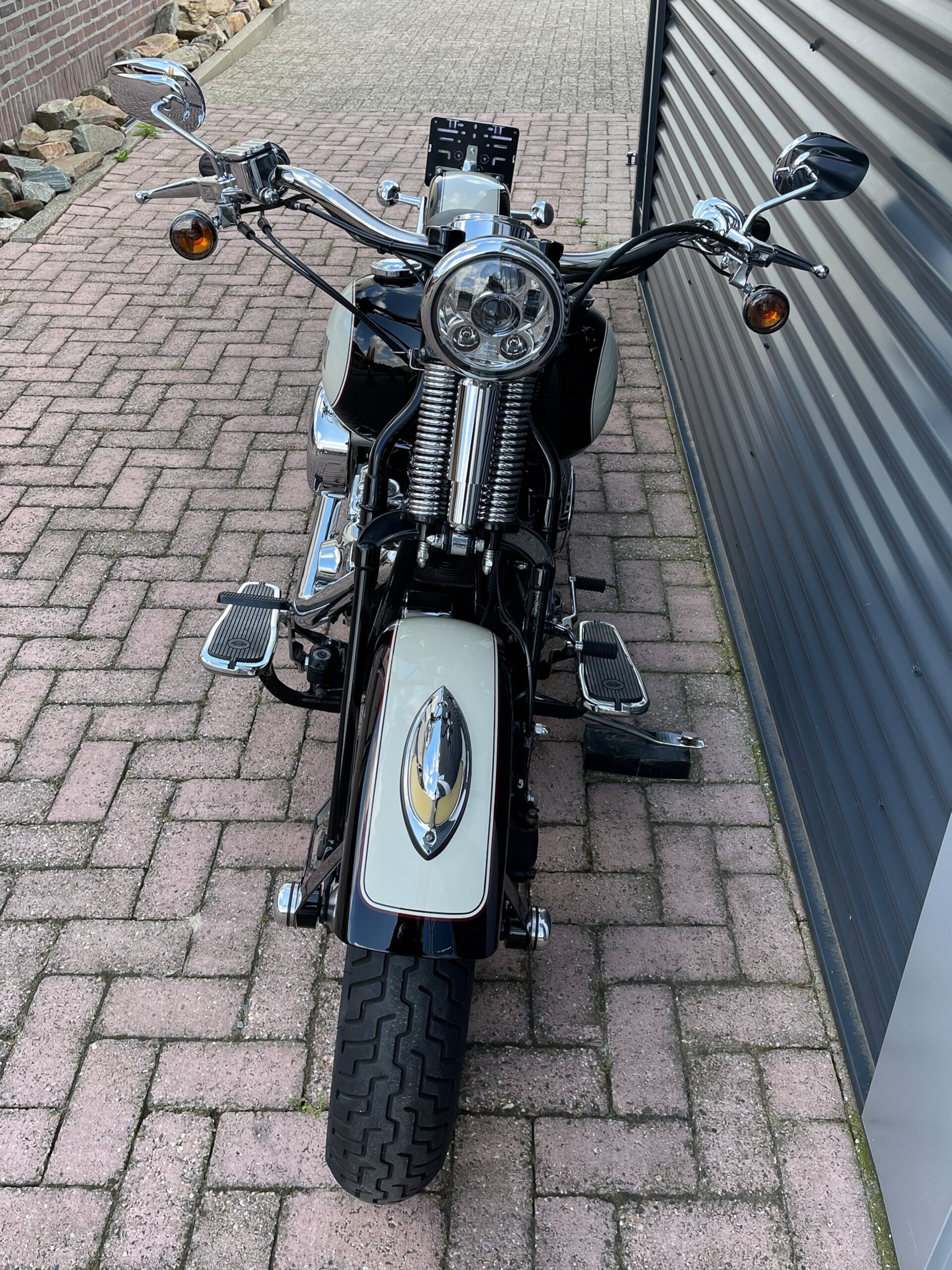 Deze Harley-Davidson Heritage softail springer uit 2005 is voorzien van Custom paint, white wall banden en een crossover uitlaat.