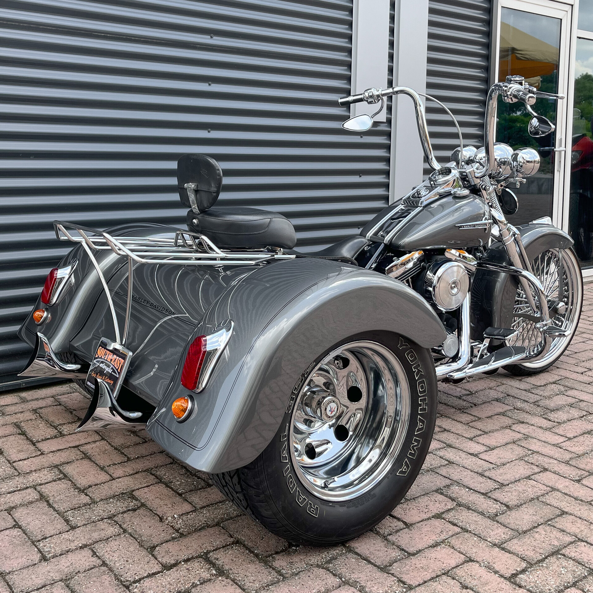 Deze Harley-Davidson heritage softail springer trike is voorzien van een Carlini ape, 21'' big spoke voorwiel en is metallic grijs. Deze trike mag je rijden met zowel een motor- als een autorijbewijs.
